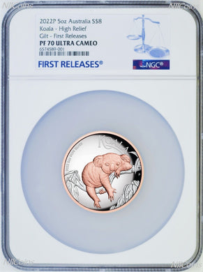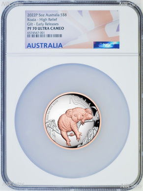 2022 Australia Pink Gold GILT HIGH RELIEF 5oz Silver Koala $8 Coin NGC PF70 ER