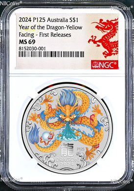 2024 Silver Lunar Year of the Dragon NGC MS69 1oz $1 Coin Yellow Facing RG Issue