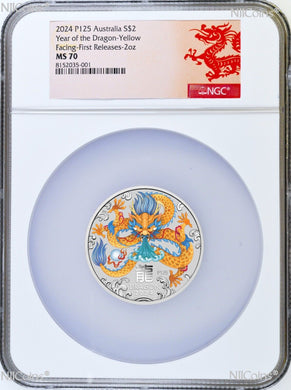 2024 Silver Lunar Year of the Dragon NGC MS70 2oz $2 Coin Yellow Facing