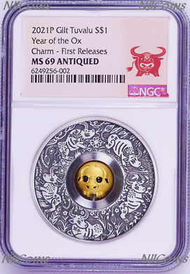 2021 LUNAR Year of the OX 1oz $1 Silver Rotating Charm Antiqued Coin NGC MS 69