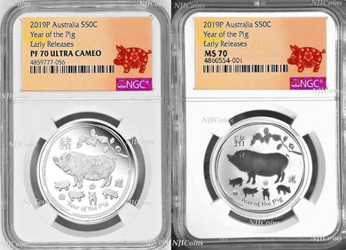 2-Coin-Set 2019 Lunar Year of the PIG 2x 1/2oz Silver NGC PF70+MS70 Proof+BU ER