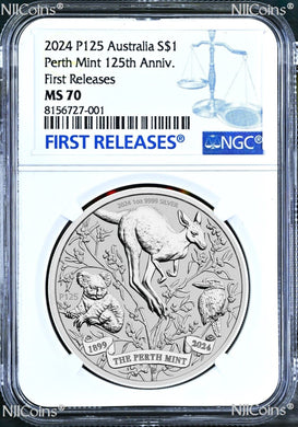 2024 P Perth Mint 125 Anniv. 1oz Silver Kangaroo/koala/Kooka NGC MS70 $1 Coin F