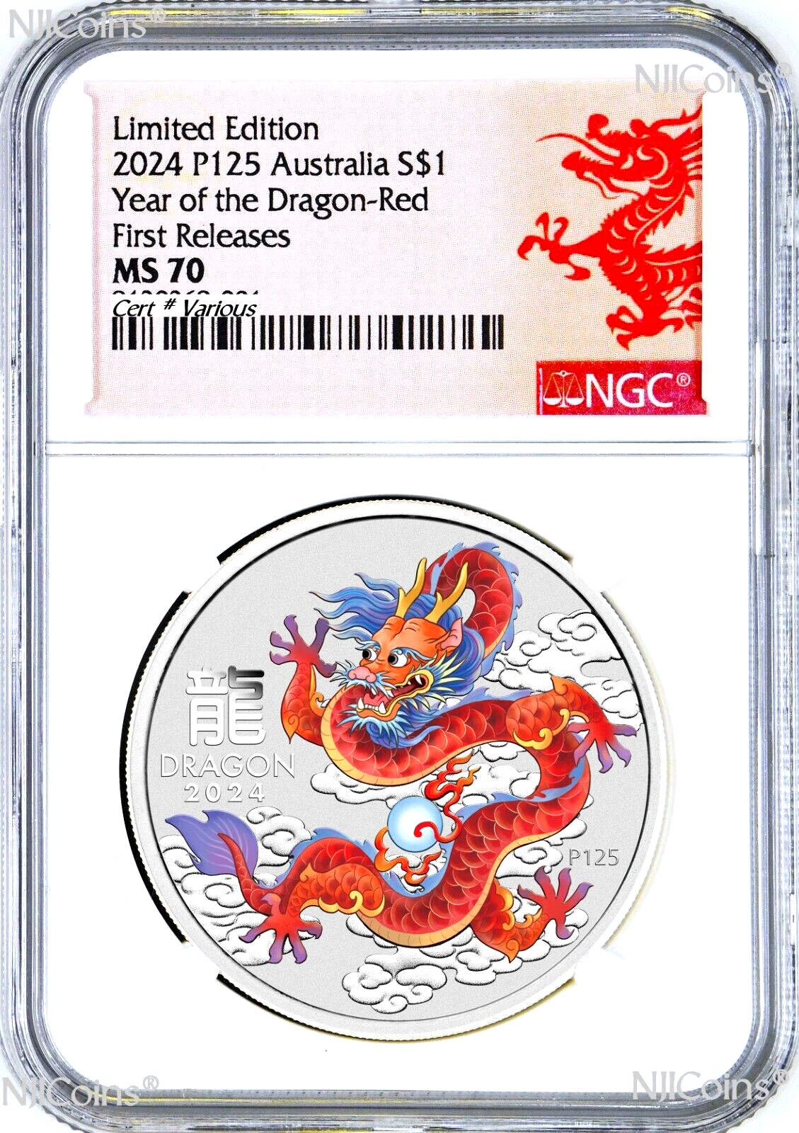 2024 P Australia Bullion 1oz .9999 Silver Lunar year of the DRAGON $1 COLORED -RED- Coin with Anniversary ‘P125’ mintmark which has been authenticated, encapsulated and graded by Numismatic Guaranty Corporation (NGC) at a PERFECT MS 70 (TOP GRADED), with the NGC Hot Red Lunar Year of the Dragon label. This coin is in perfect condition without any issue. The NGC slab is brand new. if you find any spot or hairiness in the photos it is from the scanner but not from the coin. We have more than one items in listing so the CERTIFICATION NUMBERS WILL VARY. Please ask us for any detail information.
