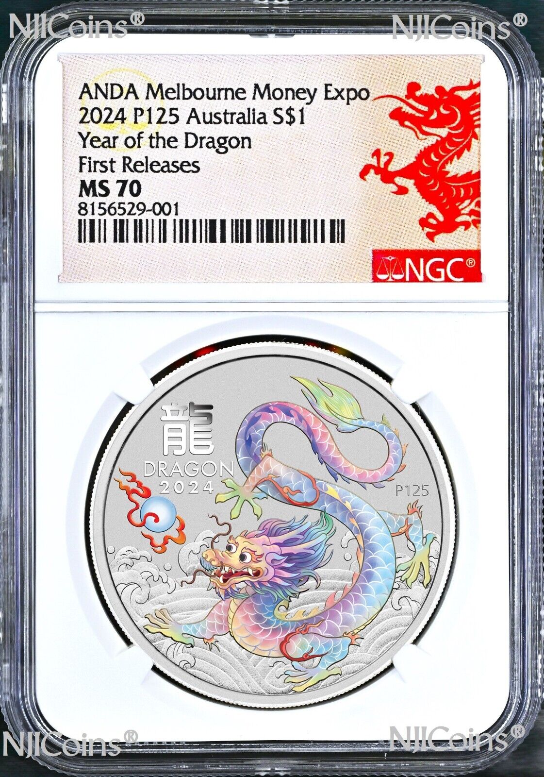 2024 P Australia 1oz .9999 Silver Lunar year of the DRAGON $1 COLORED -WHITE- Coin with Anniversary ‘P125’ mintmark FOR Brisbane Money Expo which has been authenticated, encapsulated and graded by Numismatic Guaranty Corporation (NGC) at a PERFECT MS 70 (TOP GRADED) but ERRORLY marked it as Melbourne Money Expo, with the NGC Hot Red Lunar Year of the Dragon label. This coin is in perfect condition without any issue. The NGC slab is brand new. if you find any spot or hairiness in the photos it is from the scanner but not from the coin. We have more than one items in listing so the CERTIFICATION NUMBERS WILL VARY. Please ask us for any detail information.