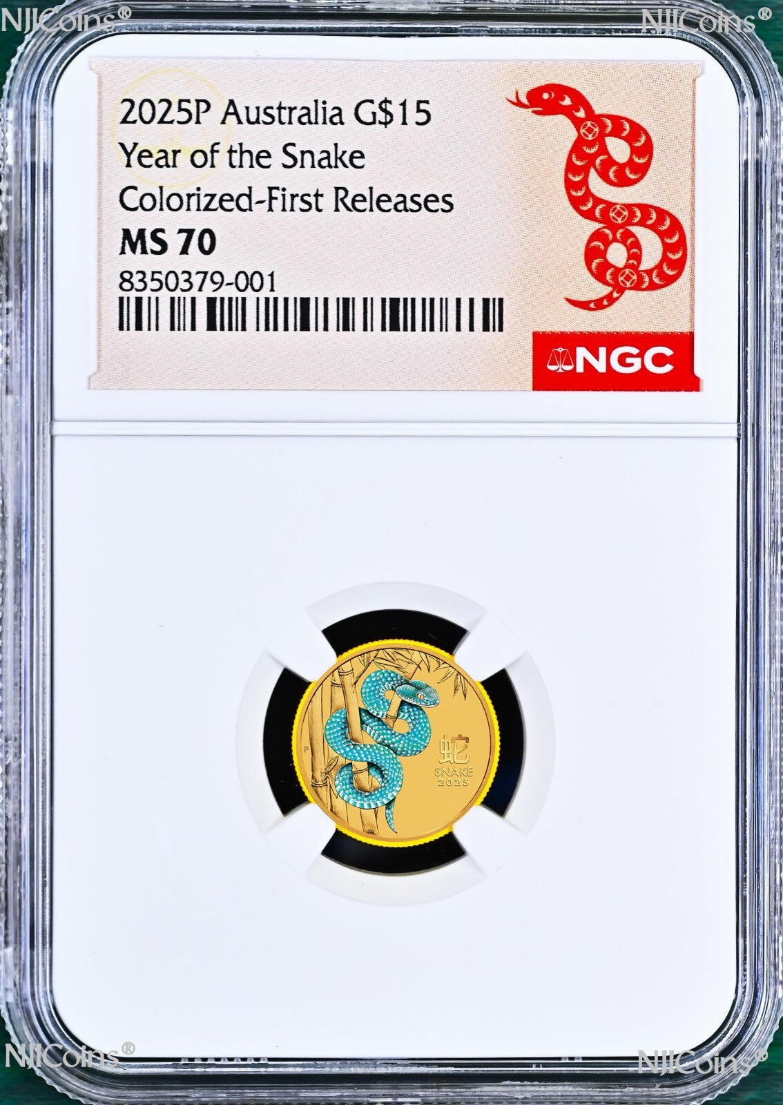 2025 P Australia .9999 pure gold Lunar year of the SNAKE $15 1/10 oz Colored bullion Coin which has been authenticated, encapsulated and graded by Numismatic Guaranty Corporation (NGC) at a perfect MS 70 (top graded), with the new designed Hot Red Snake FIRST RELEASES label. The coin is in perfect condition without any issue. The NGC slab is brand new. if you find any spot or hairiness in the photos it is from the scanner but not from the coin. We have more than one items in listing so the CERTIFICATION NUMBERS WILL VARY. Please ask us for any detail information.