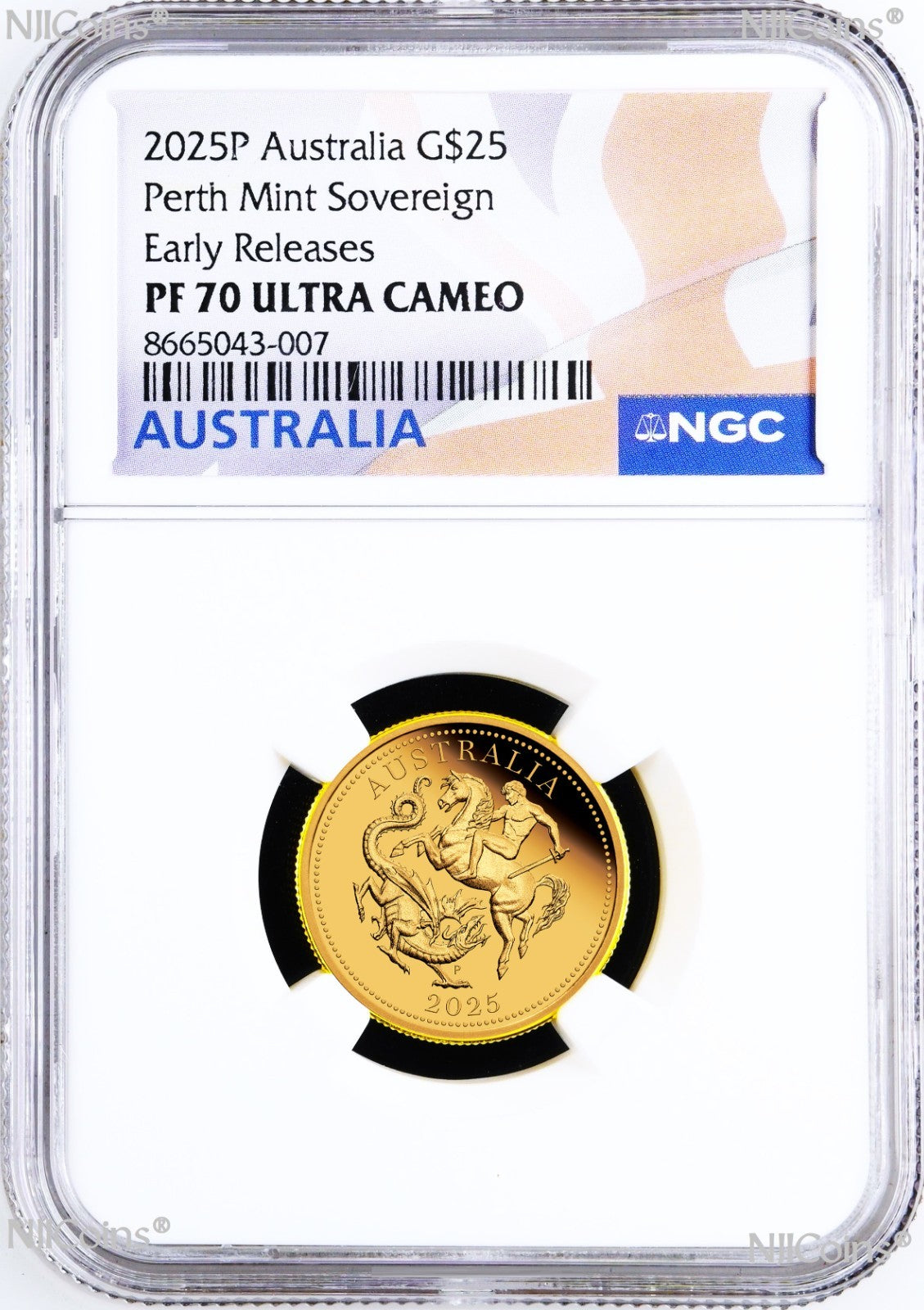 2025 Australia Sovereign 1/4 oz GOLD $25 proof coin With the new King Charles III Effigy which has been authenticated, encapsulated and graded by Numismatic Guaranty Corporation (NGC) at a perfect PF 70 Ultra Cameo (Top Graded), with the NGC EARLY RELEASE Flag labels. All coins are in perfect condition. The NGC holder is brand new. Any spot or hairiness you see in the picture are not on the coin but on the scanner. We have more than one items in listing so the CERTIFICATION NUMBERS WILL VARY. Please ask us for any detail information.
