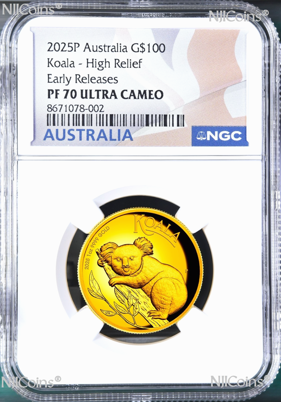 2025 Australian Koala 1oz Gold Proof High Relief $100 COIN which has been authenticated, encapsulated and graded by Numismatic Guaranty Corporation (NGC) at Perfect PF 70 Ultra Cameo, with Early Release Flag label. The coin is in perfect condition without any issue. The NGC holder is brand new. Any spot or hairiness you see in the picture are not on the coin but on the scanner or holder. We have more than one items in listing so the CERTIFICATION NUMBERS WILL VARY. Please ask us for any detail information.