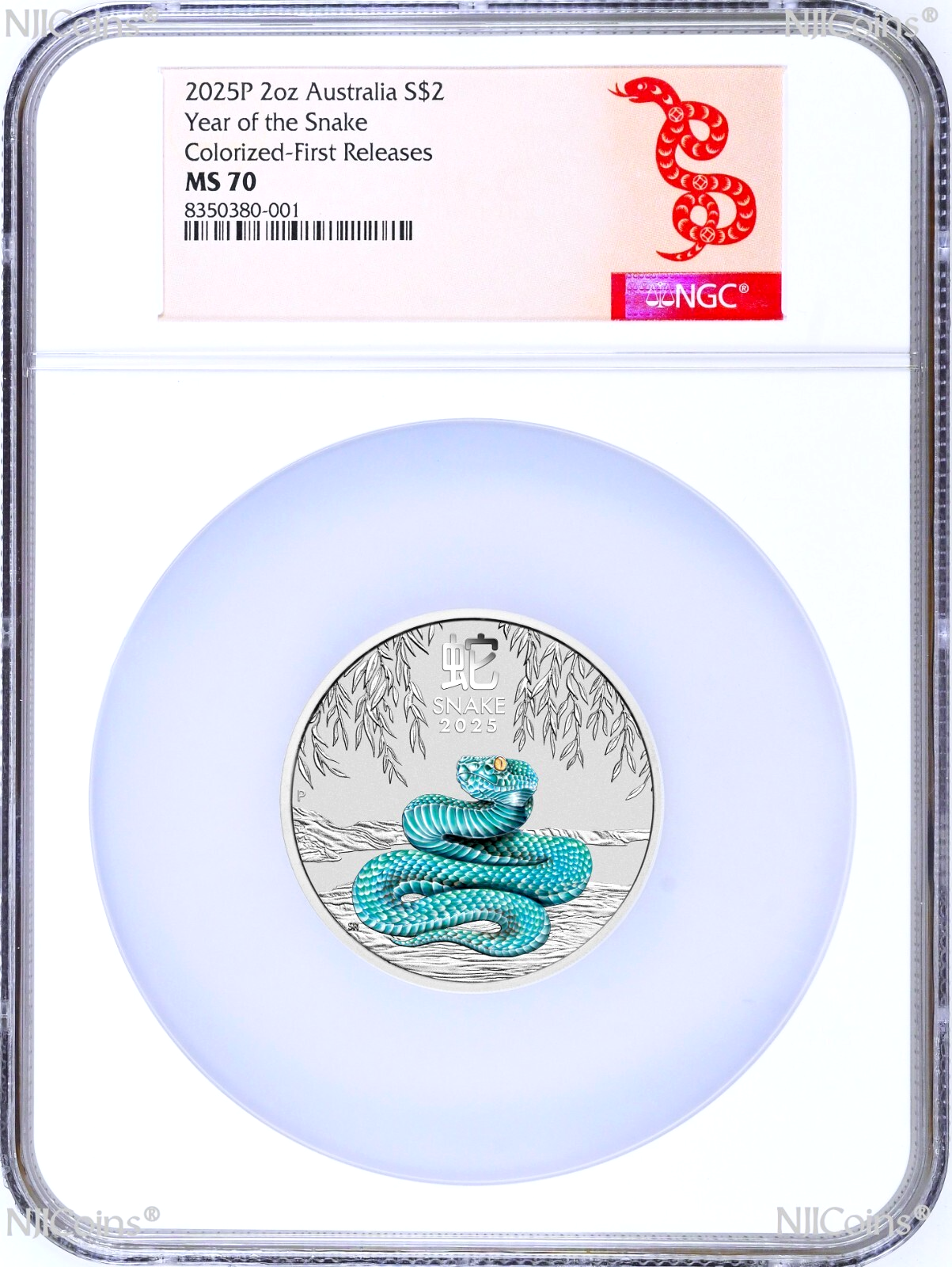 2025 P Australia Bullion 2oz .9999 Silver Lunar year of the SNAKE $2 COLORED (Light Blue with Golden Eye) Coin which has been authenticated, encapsulated and graded by Numismatic Guaranty Corporation (NGC) at a PERFECT MS 70 (TOP GRADED), with the NGC Hot Red Lunar Year of the Snake label. This coin is in perfect condition without any issue. The NGC slab is brand new. if you find any spot or hairiness in the photos it is from the scanner but not from the coin. We have more than one items in listing so the CERTIFICATION NUMBERS WILL VARY. Please ask us for any detail information.