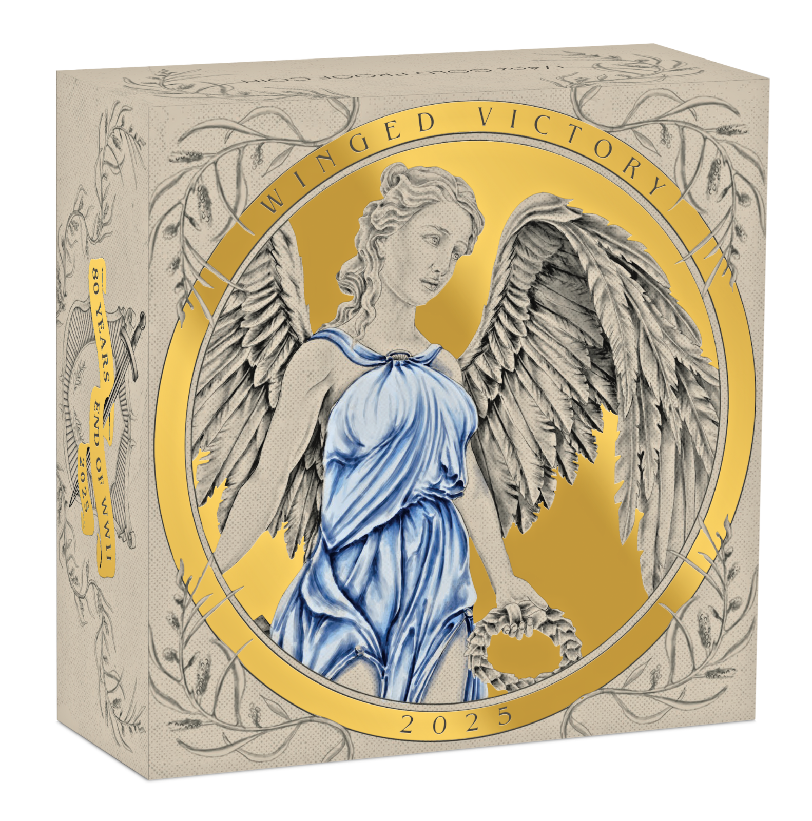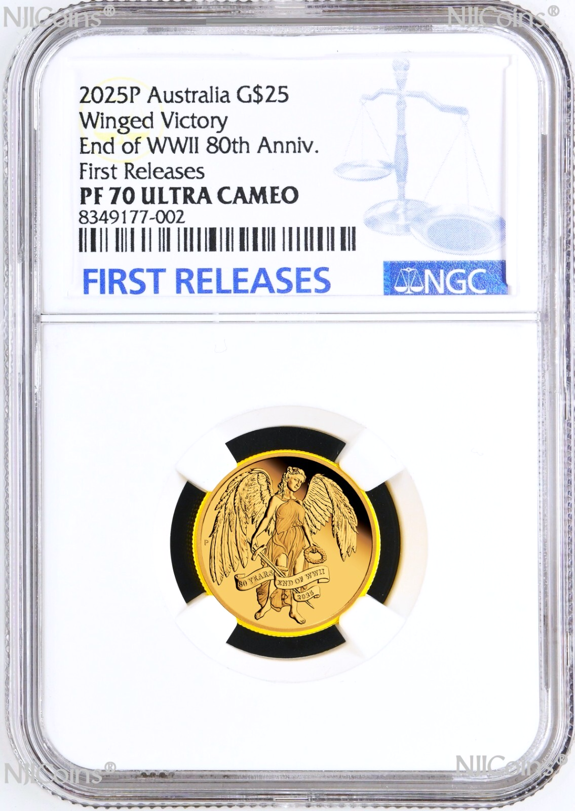 2025 80th Anniversary End of WWII - Winged Victory Proof $50 1/4 oz .9999 Gold Coin which has been authenticated, encapsulated and graded by Numismatic Guaranty Corporation (NGC) at a Perfect PF 70 ULTRA CAMEO (TOP GRADED), with the Blue "FIRST RELEASES" label. This coin is in perfect condition at this grade without any issue. The NGC slab is brand new. if you find any spot or hairiness in the photos it is from the scanner but not from the coin. We have more than one items in listing so the CERTIFICATION NUMBERS WILL VARY. Please ask us for any detail information.