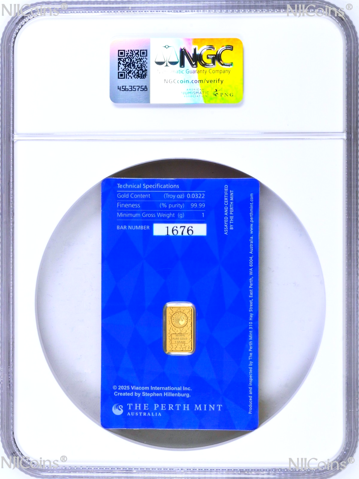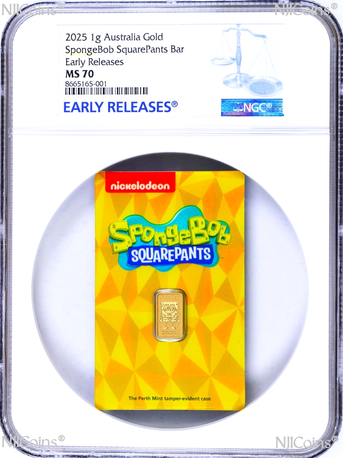 2025 P SPONGEBOB SQUAREPANTS 1g .9999 Gold Perth Mint Minted Bar which has been authenticated, encapsulated and graded by Numismatic Guaranty Corporation (NGC) at a Perfect MS 70 (TOP GRADED), with the "EARLY RELEASES" blue label. This coin is in perfect condition at this grade without any issue. The NGC slab is brand new. if you find any spot or hairiness in the photos it is from the scanner but not from the coin. We have more than one items in listing so the CERTIFICATION NUMBERS WILL VARY. Please ask us for any detail information.