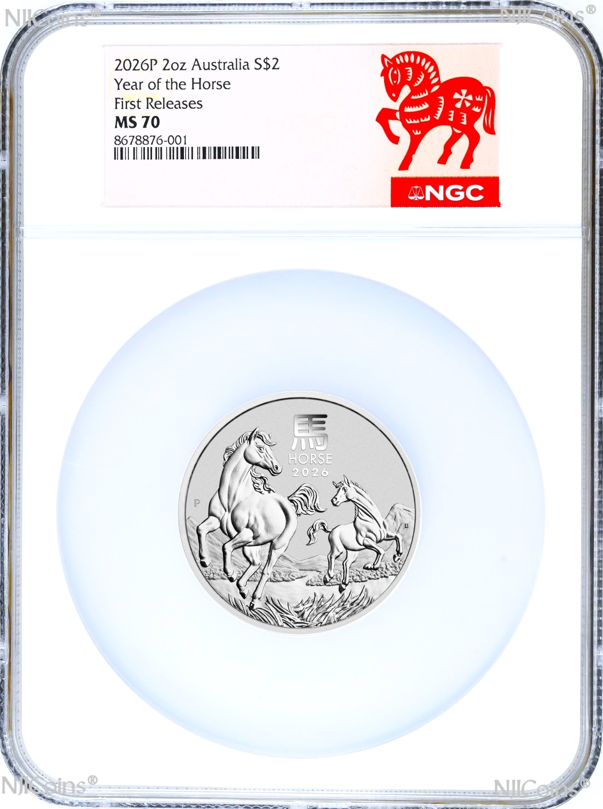 2026 P Australia Bullion 2oz .9999 Silver Lunar year of the Horse $2 Coin with the King Charles III Effigy (first time on bullion silver lunar coins) which has been authenticated, encapsulated and graded by Numismatic Guaranty Corporation (NGC) at a PERFECT MS 70 (TOP GRADED), with the NGC new designed hot Red Lunar Year of the Horse label. This coin is in perfect condition without any issue. The NGC slab is brand new. if you find any spot or hairiness in the photos it is from the scanner but not from the coin. We have more than one items in listing so the CERTIFICATION NUMBERS WILL VARY. Please ask us for any detail information.