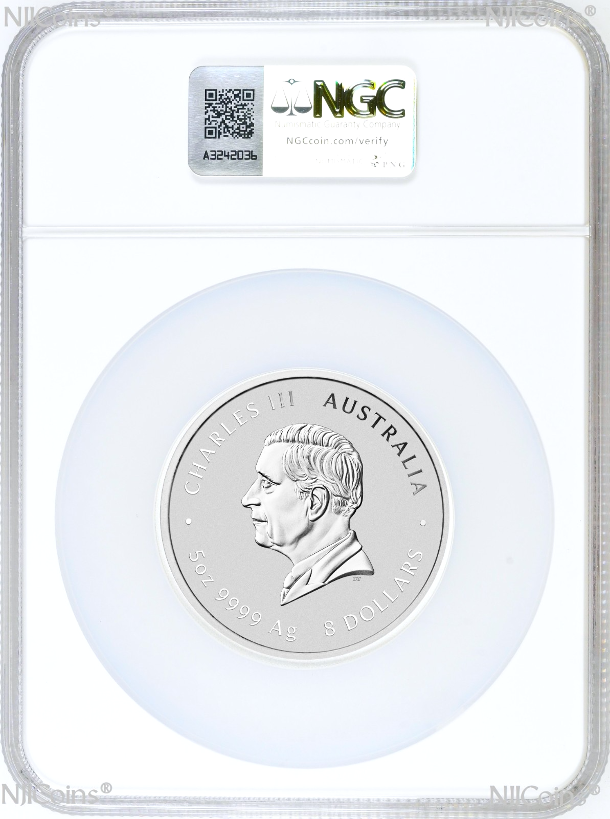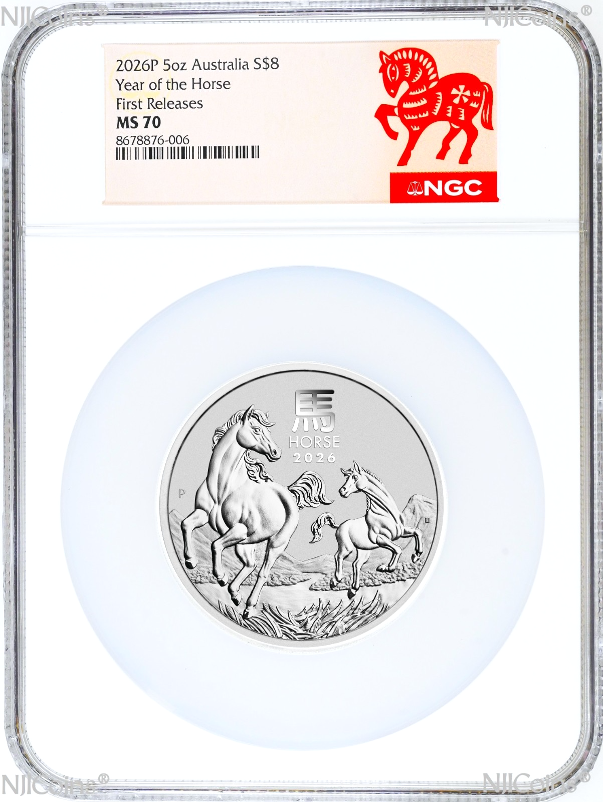 2026 P Australia Bullion 5oz .9999 Silver Lunar year of the Horse $8 Coin with the King Charles III Effigy (first time on bullion silver lunar coins) which has been authenticated, encapsulated and graded by Numismatic Guaranty Corporation (NGC) at a PERFECT MS 70 (TOP GRADED), with the NGC new designed hot Red Lunar Year of the Horse label. This coin is in perfect condition without any issue. The NGC slab is brand new. if you find any spot or hairiness in the photos it is from the scanner but not from the coin. We have more than one items in listing so the CERTIFICATION NUMBERS WILL VARY. Please ask us for any detail information.