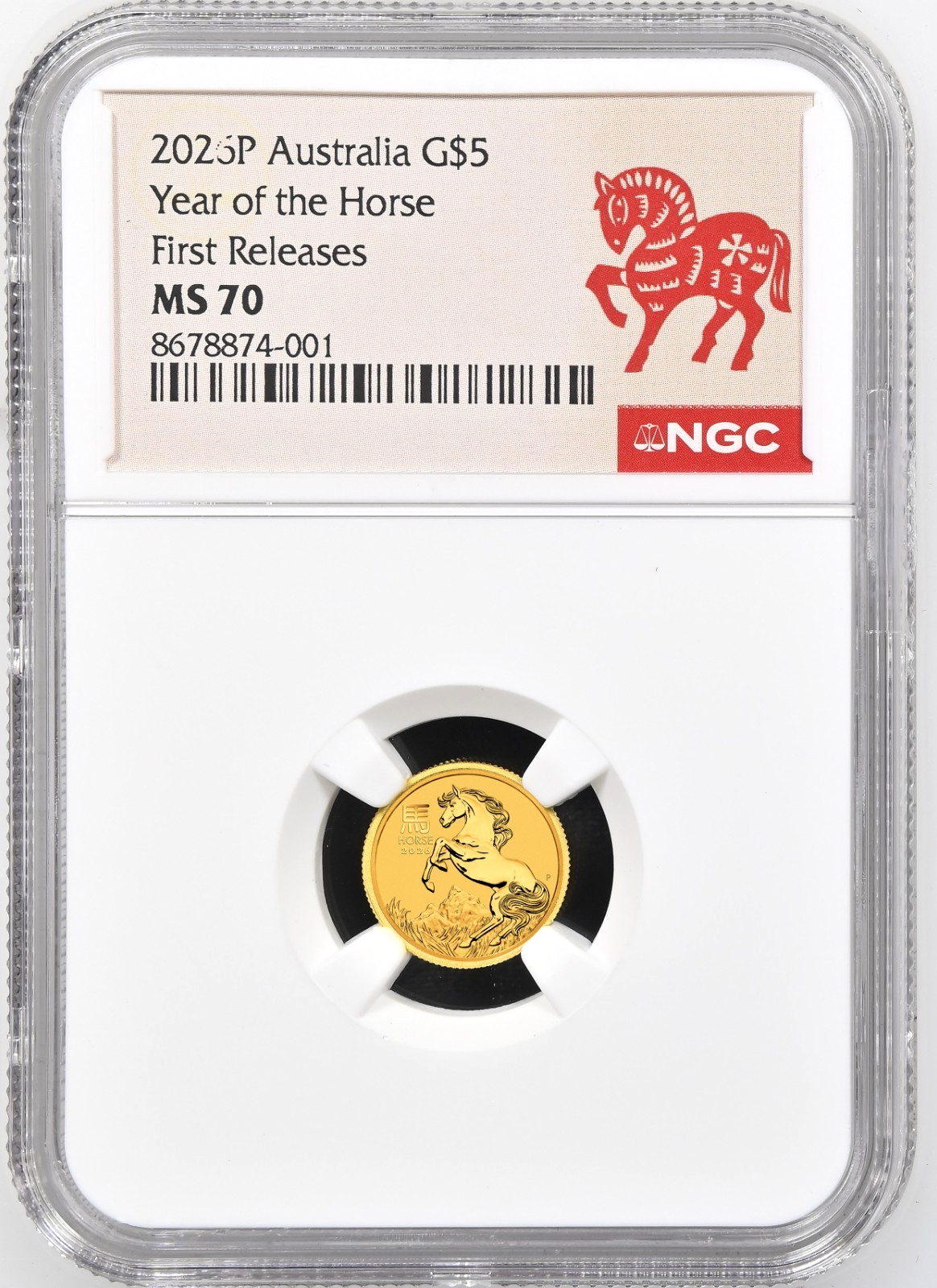 2026 P Australia .9999 pure gold Lunar year of the Horse $5 1/20 oz bullion Coin which has been authenticated, encapsulated and graded by Numismatic Guaranty Corporation (NGC) at a perfect MS 70 (top graded), with the Hot Red Horse FIRST RELEASES label. The coin is in perfect condition without any issue. The NGC slab is brand new. if you find any spot or hairiness in the photos it is from the scanner but not from the coin. We have more than one items in listing so the CERTIFICATION NUMBERS WILL VARY. Please ask us for any detail information.