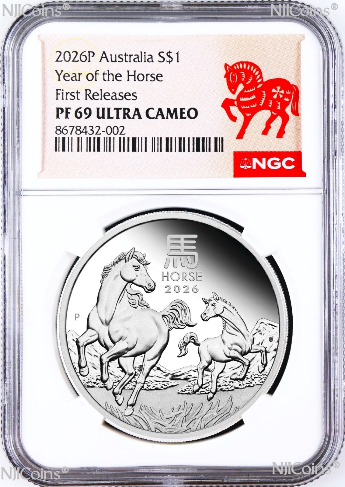 2026 P Australia PROOF 1oz Silver Lunar year of the Horse $1 Coin which has been authenticated, encapsulated and graded by Numismatic Guaranty Corporation (NGC) at PF 69 Ultra Cameo, with the NGC NEWLY DESIGNED Hot Red Lunar Year of the Horse First Releases label. This coin is in perfect condition at this grade. The NGC slab is brand new. if you find any spot or hairiness in the photos it is from the scanner but not from the coin. We have more than one items in listing so the CERTIFICATION NUMBERS WILL VARY. Please ask us for any detail information.