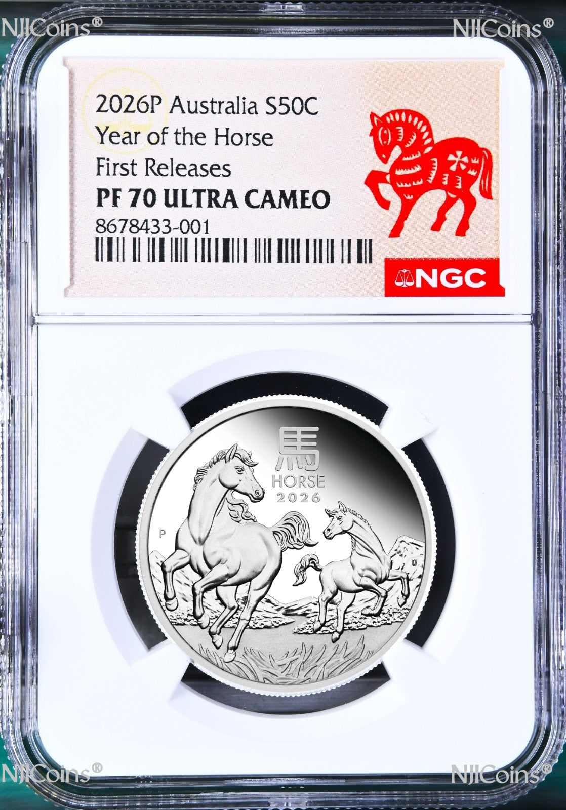 2026 P Australia PROOF 1/2oz Silver Lunar year of the Horse half dollar Coin which has been authenticated, encapsulated and graded by Numismatic Guaranty Corporation (NGC) at a PERFECT PF 70 Ultra Cameo (TOP GRADED), with the NGC NEWLY DESIGNED Hot Red Lunar Year of the Horse First Releases label. This coin is in perfect condition without any issue. The NGC slab is brand new. if you find any spot or hairiness in the photos it is from the scanner but not from the coin. We have more than one items in listing so the CERTIFICATION NUMBERS WILL VARY. Please ask us for any detail information.