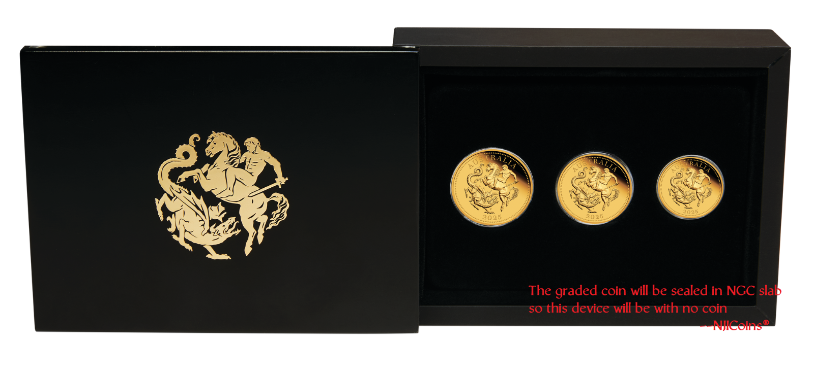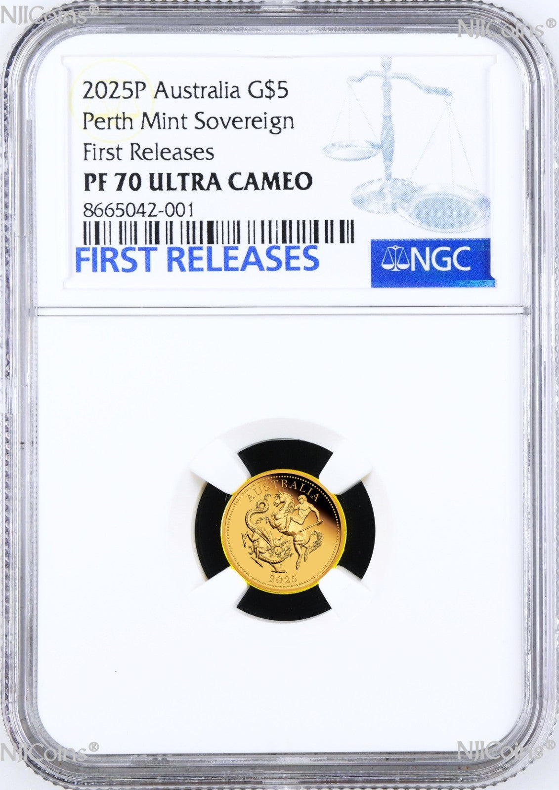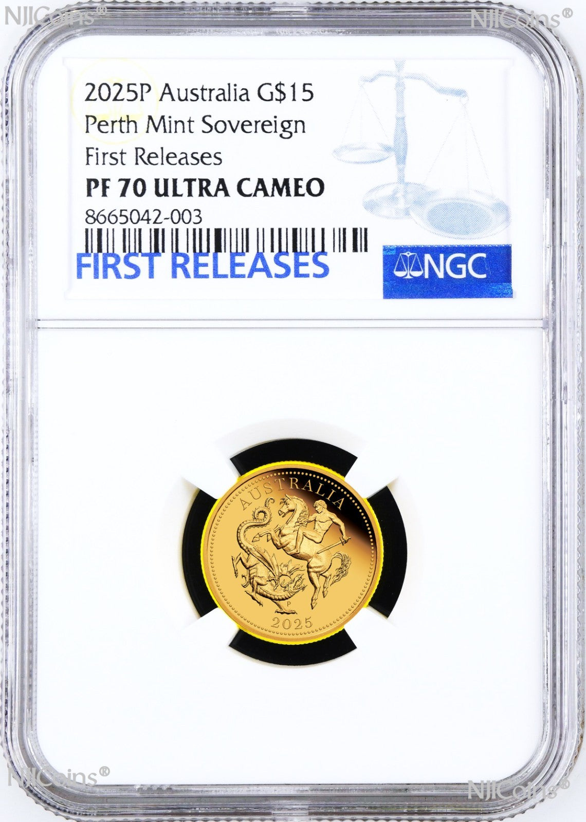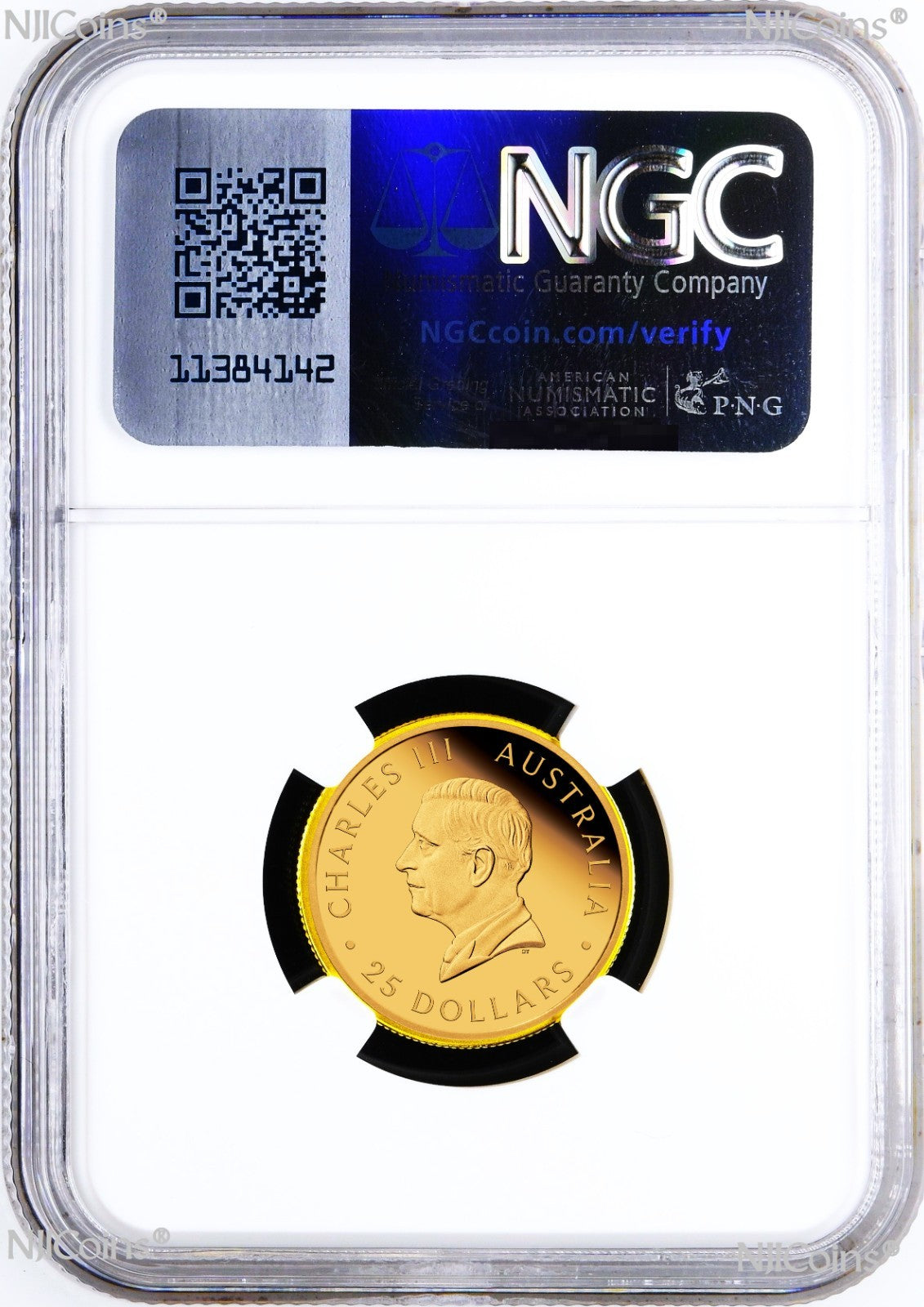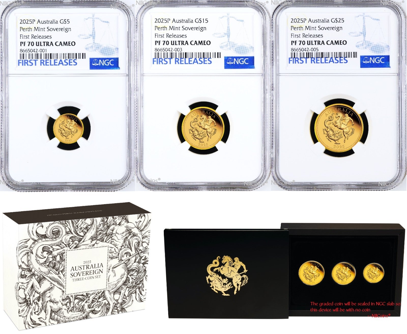 3-Coin Set: 2025 Australia Quarter, Half, and One Sovereign 0.412oz (0.059oz + 0.118oz + 0.235oz) Gold $5/$15/$25 proof coin With the new King Charles III Effigy and P125 privy which have been all authenticated, encapsulated and graded by Numismatic Guaranty Corporation (NGC) at perfect PF 70 Ultra Cameo (Top Graded), with the NGC FIRST RELEASE Blue labels and the SAME first 7-digit Cert numbers. All coins are in perfect condition. The NGC holder is brand new. Any spot or hairiness you see in the picture are not on the coin but on the scanner. We have more than one items in listing so the CERTIFICATION NUMBERS WILL VARY. Please ask us for any detail information.